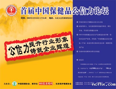 为了提高保健品的公信力,为了帮助政府培育好保健品市场,“首届中国保健品公信力品牌推选活动”组委会决定于2005年12月18日在北京人民大会堂召开“中国保健品公信力论坛”大会,会期半天。届时,将邀请国家领导人和有关部门的领导到会讲话指导,请有关专家做“保健品公信力”的报告;还邀请有关保健品企业在大会上发言。同时召开新闻发布会,向社会公布500个获得首届中国保健品公信力推选产品与企业候选名单,并公布一批假冒伪劣产品。届时首都几十家新闻单位应邀参加和报道本次会议。