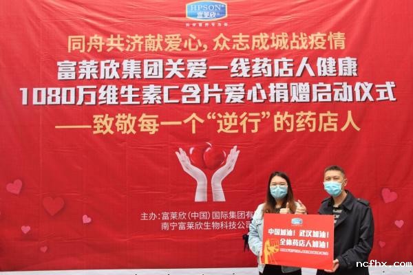 当前,疫情防控形势和任务仍然严峻而艰巨,打赢疫情防控战是我们共同的使命与责任,富莱欣集团作为膳食营养补充剂行业的领军品牌,作为一家有责任与担当的民营企业,特发起“守护药店人健康,1080万元维C暖心送”大型公益活动,向每一个坚守一线的药店人赠送一瓶价值108元的富莱欣(HPSON)维生素C含片,总数10万瓶,与全国千千万万的药店人一同抗击疫情,共克时艰!本次捐赠将分批次直接捐赠给全国各大连锁药店,由连锁药店直接分派给每一位奋战在防疫抗疫一线的广大一线店员。