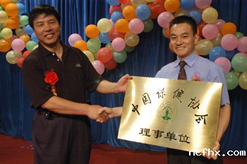 朱康年秘书长向广东普众生物科技有限公司负责人授予必威betway中文官网理事单位铜牌