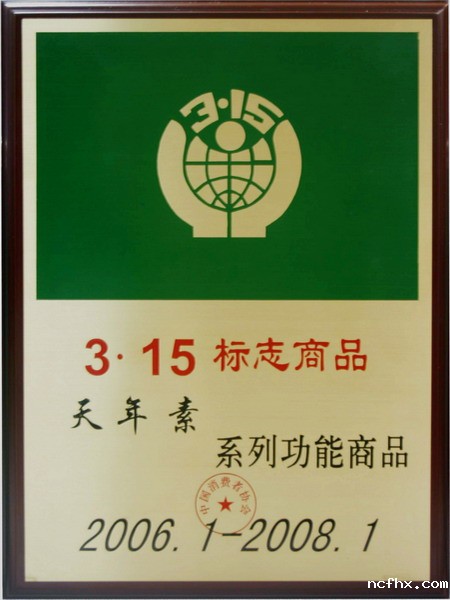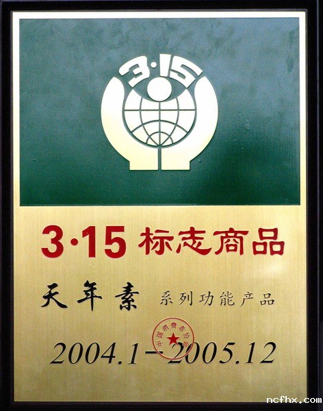 2006年1月1日,在连续两年获准使用“3.15标志”之后,由于消费者的良好口碑和一致好评,天年素产品再次被中消协获准使用“3.15标志”,这是业内唯一一家被蝉联中消协“3.15标志”的厂家,也是目前唯一被授予“3.15标志”的功能纺织品。这不仅是天年素产品的骄傲,实际上也是整个功能纺织品企业的骄傲。
