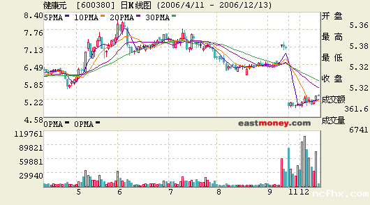 大盘持续昨日的强势,继续攀升走势。因为银行股的庞大权重,工商银行、中国银行的联袂上攻,对于指数的贡献巨大。一方面说明,虚涨的指数跨越2245点的历史高位非常容易;一方面说明银行不倒,大盘不倒。只要指数不倒,那么各种新的热点就很容易在这种市道下孕育出来,可以发现医药股近期走势比较强劲,普洛康裕(000739)两度涨停,复星医药、同仁堂都走出罕见的大幅拉高!医药板块的热点扩散,可关注健康元(600380)每股净资产高达3.45元,公司在国内保健品领域一直处于前茅,旗下包括太太口服液,静心口服液,鹰牌花旗参等多个品牌,均在各自细分市场长期保持高份额占有率。据最新 消息,健康元(600380)将向全球最大制药商美国辉瑞公司以每股6元定向增发1.5亿股, 所获得的9亿元巨资将按照美国辉瑞公司要求全部投向在中国市场最易缔造神话的保健品产业,定向增发完成之后,美国辉瑞将成为健康元的第二大股东。最近刚刚核实的消息,目前健康元的定向增发方案正在报商务部批准。值得关注的是, 辉瑞6元的收购价,较目前健康元的市价高出14%以上。