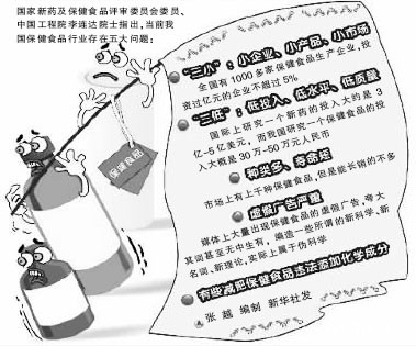 针对我国保健食品行业存在的五大问题(见图),李连达认为,我国保健食品行业应该加强科研工作,提高科研水平,提高保健食品的科技含量;加强市场管理,一方面企业要自律,另一方面群众要监督举报。此外,建议企业树立大企业、大品牌、大市场观念,这也是今后的发展方向。