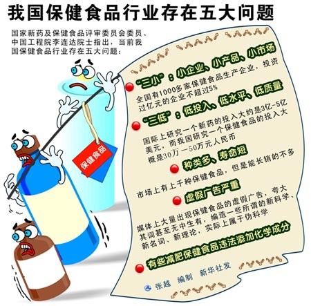针对我国保健食品行业存在的五大问题(见图),李连达认为,我国保健食品行业应该加强科研工作,提高科研水平,提高保健食品的科技含量;加强市场管理,一方面企业要自律,另一方面群众要监督举报。此外,建议企业树立大企业、大品牌、大市场观念,这也是今后的发展方向。