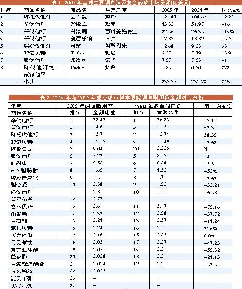 近年来,全球药品市场的增长速度已处于趋缓的态势。据全球最大的医药资讯机构美国IMS公司公布的最新信息表明,2005年北美、欧洲、日本、亚洲、非洲、澳大利亚和拉丁美洲七大国家和地区医药市场总额已达到了5659亿美元,同比上一年增长了6.9%,其中亚洲、非洲、澳大利亚3大地区增长率较欧美、日本要高出4个百分点,达到了11%。 世界销售趋缓 在10大类药物品中,调血脂类药品仍处于“领头羊”地位,达到了324亿美元,占据世界医药市场总额的5.73%,在美国市场上,阿托伐他汀与辛伐他汀的市场销售额为128亿美元,占据了全球这两个品种77.25%的市场份额。 然而,在立普妥取得了突破性的120亿美元辉煌业绩的同时,调血脂药品总体增长速度已经趋缓,增长率仅为6.8%。从全球2005年七大处方药市场最新公布数据看,调血脂类药主要品种销售额为228亿美元,仅比上一年增长了3%(见表1)。虽然市场仍有极大的潜力,但是,在主要5大他汀药品中,3个品种的销售金额已呈现负增长的严峻态势。而且一些曾一度销售额可观的的药物也放慢了脚步,原因主要与一些重磅炸弹专利到期后,廉价的仿制药迅速上市,抢占了原研药市场的不少份额有关。这对消费者和保险机构、社会保障系统来说是利好消息,但对于生产厂商却是一种不好的兆头。 血脂异常是导致动脉粥样硬化、冠心病等心脑血管疾病的主要危险因素,有效地调节血脂能够改善血管内壁斑块剥落及血栓的形成与栓塞,把心脑血管疾病的发生关口前移,对循环系统疾病的预防有着积极的作用和深远的意义。在这一理论指导下,调血脂市场在“他汀类”热卖的形势下迅猛发展。然而,关于血管壁炎症、肿胀会引起胆固醇斑破裂的学说正对传统的调血脂类药市场发起了新的挑战。近期已有国外文献报道,医学家正在试图通过血管消炎来找到治疗心血管病的最新方法。 国内市场正是成长期 近年来,全球调血脂药物的研究有了长足迈进,而HMG—CoA还原酶抑制剂(他汀类)药物的问世,是20世纪后期心血管类药物发展史上的又一个里程碑。目前,全球开发的他汀类药物已有12个品种。在我国市场上市的有8个品种,分别是阿托伐他汀钙、辛伐他汀、普伐他汀钠、氟伐他汀、洛伐他汀、美伐他汀、瑞舒伐他汀、匹伐他汀。 目前,活跃在重点城市样本医院的调脂治疗药已达20多个,2005年重点城市样本医院调血脂用药金额同比增长了28.64%,比心血管系统用药增长率21.52%高出7个百分点,按2005年全国重点城市样本医院调血脂用药总额推算,全国调血脂药物市场在20多亿元左右。 我国调血脂市场上品种繁多,按化学结构特点及调脂作用机制分类,2005年样本医院用药中,他汀类的销量占据了调脂类药总量的37.12%,苯氧芳酸类(贝特类)占11.28%,烟酸酯类占8.24%,植物提取物类占28.04%,多烯脂肪酸类及不饱和脂肪酸类占13.94%,其他类药品所占比重较小。而用药金额最大的仍属于他汀类药物,这些药物分别以不同的调血脂机制,推动了调血脂药物市场的快速进展。 据入网医院统计数据分析表明,2005年重点城市样本医院调血脂用药金额已近3亿元,其主导品种辛伐他汀、普伐他汀、阿托伐他汀、氟伐他汀和洛伐他汀占据了调血脂要市场69.79%的市场份额(见表2)。 医院终端新看点 阿托伐他汀是一个准高速增长的品种,2005年,辉瑞公司的立普妥与北京嘉林药业的阿乐均取得了较好的业绩,样本医院用药同比上一年增长了38.35%, 据推算,在国内已有3亿多元的市场规模。 在调血脂药品市场中,普伐他汀在上海施贵宝制药、上海三共制药和日本三共合力推动下,以属亲水性他汀类药物,可较少通过肝脏细胞色素p450酶系统代谢,具有老年人口服吸收迅速、蛋白结合率低和不良反应的产品特点,带动了市场的增长。该药已从上一年样本医院用药的第3名进入到第2名,市场份额达到了3734万元,上海施贵宝制药的普拉固占据了63.81%的份额,而上海三共制药和日本三共合力推动的美百乐镇也达到了36.19%的份额。 而另一个平稳增长的药物是非诺贝特,其两年间一直保持在第4名的位置上。从2005年重点城市样本医院非诺贝特使用情况看,11个厂商的片剂和胶囊贡献了2600多万元的销售金额。业内人士分析,法国利博福尼制药公司的非诺贝特胶囊“力平脂”占据了89.43%的份额,较2004年下降了3%;其次是上海爱的发制药的利必非,市场份额为10.16%;其余厂家各自的份额均较小。 据SFDA网站公布的数据,目前已获批非诺贝特原料药生产企业有12家,同时颁发了90多个制剂生产批文。今年上海爱的发系列新产品剂型的推出,将是对非诺贝特传统剂型市场的挑战,随着新剂型的开发和新产品的推出,以贝特类为代表的品类无疑将成为他汀类市场的威胁。 在烟酸衍生物类调血脂药品中,阿昔莫司是近两年表现突出的品种, 阿昔莫司为烟酸的异构体,能抑制脂肪组织的分解,减少游离脂肪酸自脂肪组织释放,从而降低甘油三脂合成,并通过抑制极低密度脂蛋白和低密度脂肪蛋白的合成,使血液中甘油三脂和总胆固醇的浓度下降,是一个新型的广谱长效调血脂新药。该品还可以抑制肝脏脂肪酶的活性,减少高密度脂蛋白的分解,具有较好的调脂作用。从统计数据看,阿昔莫司2004年在调血脂药物中排序第20位,所占份额极小,而自2001年后国内企业相继进行了开发,鲁南制药股份、四川豪富根制药、地奥集团成都药业、山东鲁