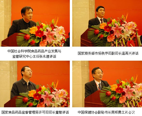 国家商务部市场秩序司副司长温再兴,国家食品药品监督管理局许可司司长童敏, 中国社会科学院食品药品产业发展与监管研究中心主任张永建均在会上发表了重要讲话。
