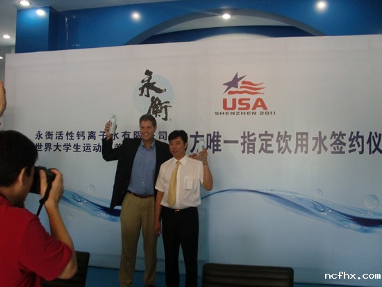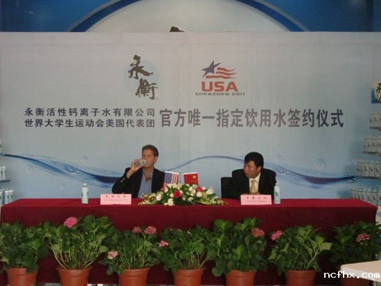 签约合影 永衡讯永衡水成为大运会美国代表团官方唯一指定饮用水的签字仪式,于2011年7月3日上午在永衡公司大厅隆重举行。本次签字仪式也倍受媒体朋友的关注,到场的媒体朋友为深圳的企业能够受到美国友人的亲赖而感到高兴。永衡公司是已将饮用水出口到美国的中国企业。 签字仪式上美国代表团团长Nels Hawkinsong表示,牵手永衡碱性钙离子水,是经过层层筛选,反复论证后的选择。他们先是在美国试饮,再派人到深圳调研,最后,通过了美国FDA检测的中国饮用水品牌——永衡碱性钙离子水,在众多品牌中脱颖而出,成为第26届世界大学生运动会美国代表团唯一指定饮用水。 在大运期间永衡公司将为450多名美国大学生运动员在比赛期间提供安全、优质的永衡碱性钙离子水。