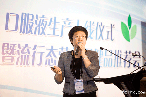 同时,仙乐制药精心研发的新品胶原蛋白口服液也浮出水面,这种水蜜桃味的鱼胶原蛋白口服液,不单每瓶含小分子量多肽鱼胶原蛋白,而且还含有来自针叶樱桃的天然维生素C,在保证美味可口的同时,还让女性消费者以快乐开心的心情获取了她想要的营养物质。其实,更为重要的是,这种口服液采用了经过EDI与反渗透技术处理的“超纯水”,非常的纯净,从而有效地保障了产品的稳定性。再加上是在10万级的纯净空间、采取UHT瞬间高温杀菌技术,并配合GMP的管理标准进行生产,因此产品根本不需要添加防腐剂就可保质两年,且口味纯正、功能因子活性十足。 本次会议上,仙乐制药还提出了一个全新的概念——“流行态营养保健品”,此类产品强调在满足消费者摄取各种营养素、功能因子需求的同时,要注意“色、香、味”,让消费者能够“方便、快捷、安全、快乐”地食用营养保健品,而不是以一种吃药的心态来进行消费。仙乐制药自2008年开始,就开始进行此类产品的研发与生产。 流行态营养保健品可以随时随地服用(有些产品甚至不要水),服用量也没有太大的限制,产品具有流行趋势,开发周期较短,以市场为主导,是年轻人群、特别是中青年女性的最佳选择。除胶原蛋白口服液外,牛磺酸维生素饮品、多维营养软糖、DHA营养软糖、果蔬纤维粉、益生菌粉、蛋白粉都可以是典型的流行态营养保健品。 仙乐制药在产品推荐会上,还创新性地向客户推荐了一些新鲜的饮用方法。如“益清两白”,就是将益生菌粉与胶原蛋白粉溶入荔枝汁内进行饮用,让女性消费者能内外兼修,满足美容需要的同时,还非常的清爽可口;如“苹添春色”,则是将果蔬纤维粉溶入苹果汁中,同样有可口又营养的效果。  运营副总经理陈琼演讲
