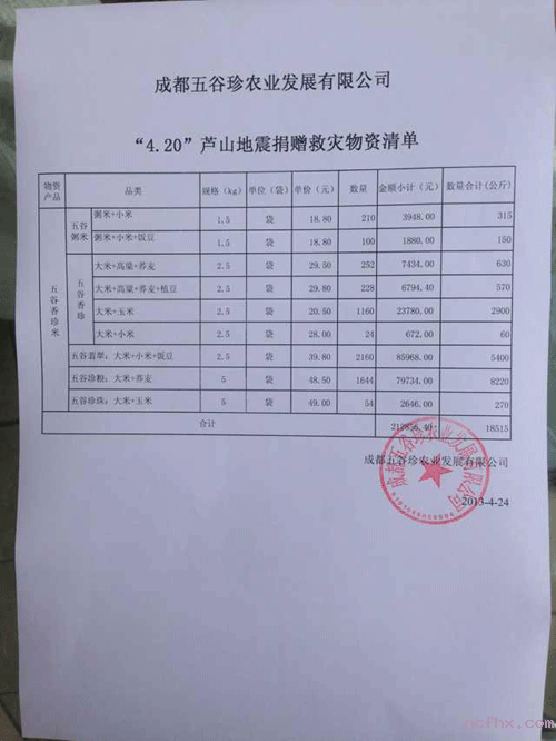 成都五谷珍农业发展有限公司捐赠物资20万元