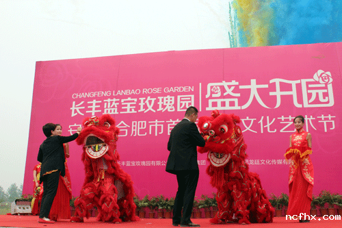 伴随着礼乐声,王静董事长和李晓亮总经理上台为醒狮点睛,宣布长丰蓝宝玫瑰园盛大开园。