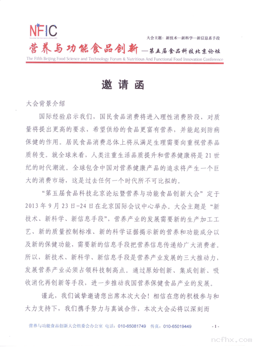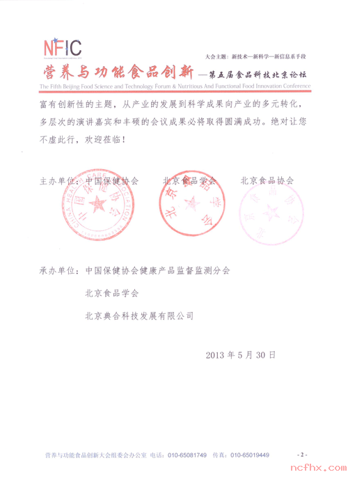一、 时间和地点 大会时间:2013年9月23-24日(22日外地代表全天报到) 举办地点:北京国际会议中心 二、主要参会嘉宾 • 各省市食品药品监督管理局、食品药品检验所、政府保健食品监管部门; • 国家及省市功能食品研究中心;食品科研院所、大专院校、医疗机构; • 功能食品生产企业高层领导,研发、技术、质量、法规等部门负责人; • 功能食品配料与添加剂生产企业中的研发、技术、营销人员; • 功能食品生产加工和检测技术产品供应商、服务商; • 功能食品第三方检验和认证机构、媒体及其他相关单位等。 三、宣传媒体 新华社、人民日报、经济日报、北京日报、北京青年报、新京报、北京晚报、CCTV、北京电视台、新浪网、健康网、腾讯网、搜狐、中国食品报、人民网、食品商务网等等 四、参会说明 1、代表参会A: 2600元人民币/人,参加会议、含两餐与会议资料,不含住宿。 2、代表参会B: 5800元人民币/人,参加会议、含两天食宿及会议资料。 嘉宾身份参会,佩带VIP胸卡; 刊登嘉宾参会单位会刊广告1页; 现场派发贵单位宣传资料; 安排和与会演讲嘉宾、领导会面合影; 安排嘉宾席就坐,席位放置名牌; 得到全套会议资料; 刊登单位领导照片; 安排两天四星级以上酒店食宿 3、参展单位:;标展(3X3):11800人民币 标展(2X3):8800人民币 刊登参展单位会刊广告1页;现场派发单位宣传资料;安排和与会演讲嘉宾、领导会面合影;安排领导嘉宾席就坐;领导席位放置名牌;得到全套会议资料;刊登单位领导照片; 五、组委会联系方式: 大会主席:北京食品学会理事长 金宗濂 秘书处联系人: 许 薇 电 话: 010-65081749 传真:010- 65019449 电子邮箱:spkjlt@126.com 大会议程 2013年9月23日 (星期一) 9:00-9:20 致辞嘉宾:卫生部原副部长,必威betway中文官网理事长 张凤楼先生 北京食品学会理事长 金宗濂先生 企业特邀代表 9:20-12:00 大会发言: 营养强化食品与营养强化剂 全谷物食品 婴幼儿配方食品 保健食品的市场发展趋势 膳食补充剂发展趋势与市场需求 13:00-18:00 功能性新原料与保健食品产品研发创新 保健食品包装现状及发展趋势 功能性新原料及保健食品产品创新产品的报批注册策略 大力发展我国特殊医学用途配方食品 建立与国际接轨的标准体系 新信息技术有力推动营养与保健食品的传播 天然植物提取物的生产,质量标准与审评要求 保健食品新功能的研发与注册 2013年9月24日 (星期二) 专题研讨会 新型功能材料专题 婴幼儿食品专题 蜂产品专题 强化食品与膳食补充剂专题 胶原蛋白肽专题 益生菌专题 新资源食品专题 功能糖专题