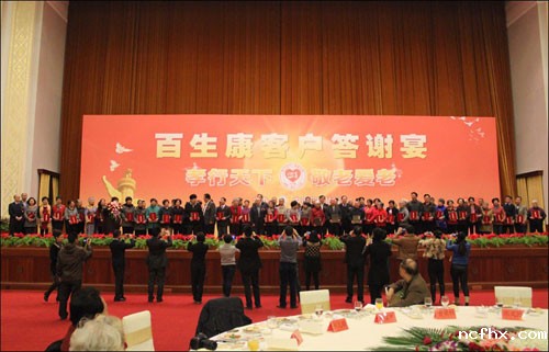 宴会前,来自全国各地的百生康孝善代表们,从大会堂北门进入,整齐有序的向南,通过有八米宽、62级的汉白玉阶梯通往二层宴会厅,并在楼梯顶端的迎宾厅拍摄了集体合影,共同定格了难忘的历史瞬间。 宴会在百生康人自己作词作曲、演唱的《孝美天下》歌声中拉开序幕,随后,来自中央电视台和湖南卫视的两位主持人登上舞台,宣布活动正式开始。 随后,多位到会领导一一发表了热情洋溢的讲话,在肯定国家大力发展健康服务业的大政方针的同时,也深刻意识到了健康服务的重要性与必要性,更对百生康公司所倡导的孝善文化和一直以来的生产、经营的优质健康产品和云健康管理服务给予了高度的认可和肯定。