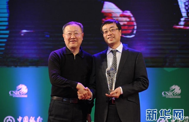 由新华网发起,与中国社科院经济学部企业社会责任研究中心主办,新华社新闻研究所、新华每日电讯社、经济参考报社、参考消息报社等单位联合主办的“第六届中国企业社会责任峰会暨第三届《中国企业社会责任报告白皮书》发布会”于2014年1月17日在北京隆重举办。碧生源控股有限公司荣获“2013年度中国企业社会责任杰出中小企业奖”。图为新华社新媒体中心常务副主任陈凯星为碧生源控股有限公司董事长赵一弘颁奖。新华网