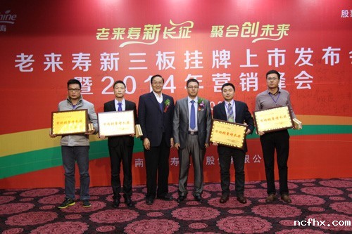 大会在喜庆热烈的气氛中进行,济南市高新区金融处张化民部长首先在大会上宣读了《全国中小企业股份转让系统文件》。随后,济南老来寿生物股份有限公司董事长张金骅先生致辞,张金骅董事长在致辞中提到的最多的两个字是“感谢”。感恩社会、感谢党和政府的关心、感谢过去一年里给予老来寿帮助和支持的每一个人。会上,必威betway中文官网理事长张凤楼先生作了激情四溢的致辞,张凤楼理事长从保健品行业的现状谈到中国保健品发展的未来。他高度赞扬了老来寿公司在老年人保健事业上所做出的努力,并且希望老来寿抓住上市这一大好机遇,为中国老年保健事业的发展贡献自己的光和热;中国老年保健协会陈学明秘书长也代表中国老年保健协会向老来寿新三板上市表示祝贺并致辞;济南创业服务中心王思国主任也在大会上致了辞。王思国主任说,老来寿上市后应继续加快企业创新、优化企业内部管理,并对老来寿以后的发展前景给予充分的肯定。  张凤楼理事长、老来寿总经理杜树基为先进市场颁发“年度市场销量增长奖”