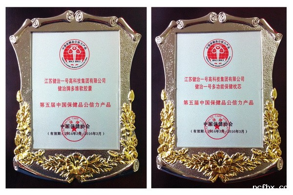 2014年3月30日,“第五届中国保健品公信力论坛暨第五届保健品公信力产品及品牌推选活动表彰大会”在京召开。健治一号旗下产品多功能保健枕和多维胶囊均荣获第五届中国保健品公信力产品。