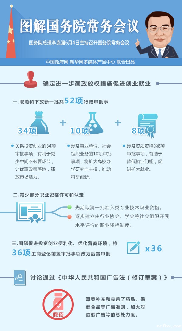 国务院总理李克强6月4日主持召开国务院常务会议,确定进一步简政放权措施促进创业就业,部署石化产业科学布局和安全环保集约发展,讨论通过《中华人民共和国广告法(修订草案)》。 会议认为,简政放权是深化政府改革、加快转变政府职能的关键之举。在去年取得积极成效的基础上,按照《政府工作报告》确定的年内再取消和下放200项以上行政审批事项的部署,针对社会关切,继续下好改革先手棋,进一步推出新的有力举措,对于充分调动企业和社会创业创新创造的积极性,让政府更好归位、市场更大发力、群众更多受益,具有重要意义。会议确定,一是取消和下放新一批共52项行政审批事项,其中“享受小微企业所得税优惠核准”,“对吸纳下岗失业人员达到规定条件的服务型、商贸企业和对下岗失业人员从事个体经营减免税审批”等关系投资创业的34项审批事项,有利于减少中间不必要环节,让优惠政策落地,释放市场活力;“高等学校博士学科点专项科研基金审批”等涉及事业单位、社会组织业务的10项审批事项,将扩大高校办学研究自主权,推动科研创新;涉及资质资格的8项审批事项,有助于降低执业门槛,促进扩大就业。二是减少部分职业资格许可和认定。会议确定,今后,凡没有法律法规依据和各地区、各部门自行设置的各类职业资格,不再实施许可和认定。逐步建立由行业协会、学会等社会组织开展水平评价的职业资格制度。当前,一些职业资格许可和认定,已经不适应市场经济发展需求,也缺乏法律法规的依据,积极进行调整很有必要。在市场经济条件下,更需要专业化、社会化的职业水平评价。这一方面可以提高劳动者专业素质,真正实现术业有专攻;另一方面可以提高人力资源配置效率,提升社会的创新能力。 会议讨论通过了《中华人民共和国广告法(修订草案)》。为规范广告活动,更好保护消费者权益,草案补充和完善了药品、保健食品等广告准则,加大对虚假广告等的惩处力度。草案经进一步修改后将提请全国人大常委会审议。