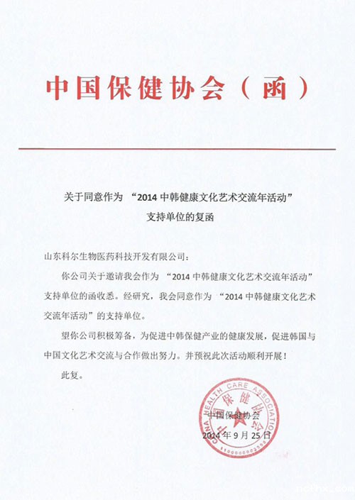山东科尔生物医药科技开发有限公司: 你公司关于邀请我会作为 “2014中韩健康文化艺术交流年活动”支持单位的函收悉。经研究,我会同意作为 “2014中韩健康文化艺术交流年活动”的支持单位。 望你公司积极筹备,为促进中韩保健产业的健康发展,促进韩国与中国文化艺术交流与合作做出努力。并预祝此次活动顺利开展! 此复。