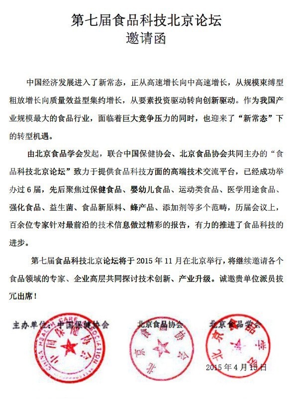 主办单位:必威betway中文官网 北京食品学会 北京食品协会 支持单位:北京联合大学营养与功能食品研究院 江南大学营养与功能食品研究院 中国医药保健品进出口商会 支持媒体:中国经济时报社 中国食品报 新营养杂志社 食品科技杂志社 中国老年报 中国妇女报 时 间:2015年11月5-6日 地 点:北京丰大国际大酒店 会议安排: 11月5日 上午 开幕式 技术时代(三层昆仑厅) | · 主持:北京食品学会常务副理事长 徐开生 · 嘉宾:必威betway中文官网会长 张凤楼 · 嘉宾:北京食品学会理事长 姜招峰 ·嘉宾:国务院发展研究中心研究员、中国经济时报党组书记 王忠宏 (大健康产业投资与发展) ·嘉宾:国家发展和改革委员会宏观经济研究院副主任 曾红頴 演讲题目:健康服务业的发展 ·嘉宾:必威betway中文官网副秘书长 黄建生 演讲题目:食品安全法中关于保健食品法规的分析(预测) ·嘉宾:北京市科学技术协会科技成果转化平台主任 朱希铎 (食品科技成果转化势在必行) | 11月5日 下午 平行会议 | 1、运动、抗衰老技术发展研讨会(二层百味园) | 交流题目与对话嘉宾: · 主持:北京市营养源研究所 李东教授 · 嘉宾:中国老年保健协会副会长 张家喜教授 演讲题目:老年人保健食品市场调查与分析 · 嘉宾:北京联合大学功能食品科学技术研究院院长 姜招峰教授 演讲题目: AD的氧化发生与还原修复 · 嘉宾:北京工商大学 刘新旗博士 演讲题目:提高老年人免疫力,预防肌肉萎缩 · 嘉宾:国家体育总局体育营养研究中心 伊木清研究员 演讲题目:运动营养评价方法和程序 · 嘉宾:国家体育总局体育科学研究所 杨则宜教授 演讲题目:全球运动营养食品发展趋势 · 嘉宾:北京大学第三医院运动医学研究所 常翠青研究员 演讲题目:乳清蛋白在运动营养中的应用 | 2、特膳、母婴食品发展论坛(二层百合园) | 交流题目与对话嘉宾: · 主持:北京市粮食科学研究院 贾建斌院长 · 嘉宾:江南大学食品科学与技术国家重点实验室 江波教授 演讲题目:低聚半乳糖的生物制备 · 嘉宾:日立高新技术公司先端分析仪器部工程师 梁仁雷博士 演讲题目:关注乳品质量,共享健康生活 · 嘉宾:帝斯曼中国人类营养与健康营养科学事务推广总监 张卫国 演讲题目:从生命早期营养和肾脏发育看高血压的起源 · 嘉宾:中国CDC营养与健康所 杨振宇 演讲题目:乳母微量营养素的状况对乳汁微量营养素的影响 · 嘉宾:丰益(上海)生物技术研发中心有限公司高级经理 常桂芳博士 演讲题目:中国市场婴幼儿配方奶粉脂肪酸数据解析 · 嘉宾:科汉森(北京)贸易有限公司健康与营养部 王凤英 演讲题目:母乳中有益菌的研究 · 嘉宾:西北农业大学农业部奶山羊研究室主任、陕西省奶山羊产业体系 首席专家 曹斌云教授 演讲题目:优质羊奶情健康中国梦 | 3、健康饮品新技术研讨会(二层百乐园) | 交流题目与对话嘉宾: · 主持:中国农科院农产品加工所 戴小枫教授 · 嘉宾:中国农业大学食品学院 廖小军教授 演讲题目:果蔬汁的加工与创新 · 嘉宾:杜邦营养与健康大中华区菌种商务总监 金苏博士 演讲题目:益生菌功效研究进展及相关解决方案 · 嘉宾:利乐包装(昆山)有限公司 曹雷博士 演讲题目:功能性食品开发的新天地 · 嘉宾:安徽锦乔生物科技有限公司 谢佩珊 演讲题目:益生菌国内外现状及发展趋势 · 嘉宾:大江生医股份有限公司总经理 林詠翔 演讲题目:机能性饮料的新产品开发与全球发展趋势 | 11月6日 上午 平行会议 | 4、利统专场(二层百乐园) 交流题目与对话嘉宾: · 嘉宾:台湾利统股份有限公司总经理/董事长 张天鸿博士 演讲题目:国际保健食品产业的发展趋势 · 嘉宾: 台湾乳酸菌协会荣誉理事、亚洲乳酸菌学会联盟会长 蔡英杰教授 演讲题目:益生菌保健机能新进展:脑肠轴与精神益生菌 · 嘉宾:台湾保健食品学会秘书长 詹吟菁教授 演讲题目:脑力保健之相关研究 · 嘉宾:台湾利统股份有限公司研究员 张薇婷教授 演讲题目:天然双胜肽与植萃物之抗疲劳与降尿酸之研究 | 5、大健康产业投资论坛(二层百合园) | 交流题目与对话嘉宾: · 主持: 新营养杂志总编、天使投资人 常志远博士 · 嘉宾:全国人大常委会法律工作委员会行政法室副主任 黄薇 演讲题目:新食品安全法中关于保健食品立法的背景剖析 · 嘉宾:北京食品学会名誉理事长 金宗濂教授 演讲题目:新政策法规体系下营养功能学研究与方向 · 嘉宾:中国医药保健品进出口商会 张中朋副主任 演讲题目:国内外保健品市场发展趋势 · 嘉宾:必威betway中文官网检测分会 徐峰会长 演讲题目:健康产业发展的逻辑 · 嘉宾:光华博思特营销咨询机构总裁 韩志辉博士 演讲题目:大健康产业投资与企业品牌建设 | 6、微生态未来技术革命趋势研讨会(二层百味园) | 交流题目与对话嘉宾: · 主持:总后军需装备研究所 郝利民教授 · 嘉宾:中国军事医学科学院 张成岗研究员 演讲题目:肠道菌群微生态与人体慢病和健康的因果关系研究 · 嘉宾:中国食品发酵工业研究院 张金泽教授 演讲题目:益生元在保健食品中的应用 · 嘉宾:江苏片山食品有限公司 陆峰博士 演讲题目:稀少糖对人体健康的意义 · 嘉宾:第七营养生物科技武汉有限公司 刘安文博士 演讲题目:膳食纤维功能食品的发展现状与应用前景 | 备注:会议课题将会根据会议当天实际进展调整 | 报道媒体 中国食品报、食日谈